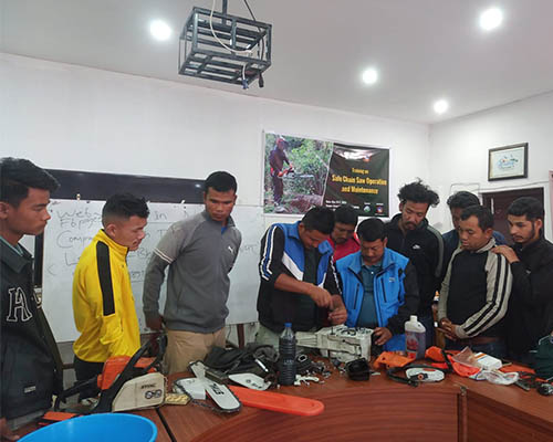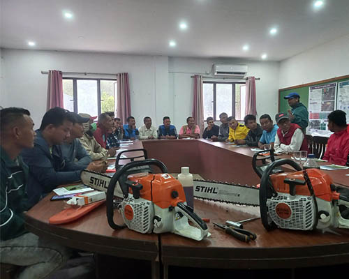 A total number of 24 diverse participants from different fields (forestry workers, farmers, sawmill operators, construction workers, drivers, etc) attended the session. The first day of the session focused on "Introduction to Chainsaw Operation and Safety" where theoretical knowledge on usage, components, maintenance, and environmental considerations of chainsaw operations were discussed. Similarly, the second day aimed to enhance the participant's theoretical knowledge through practical exercises, safety procedures, and legal & regulatory methods.